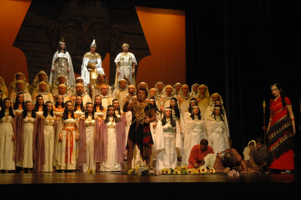 La historia se desarrolla en Menfis y Tebas. Aída, una etíope esclava vive en el palacio imperial de Menfis. Está enamorada de Ramadés, el valiente guerrero Egipto, que en secreto le corresponde. En ese contexto, las tropas etíopes están invadiendo el Imperio, conducidos por Amonastro, el padre de la cautiva. El encargado de dirigir el combate para derrotarlas es Ramadés. La State Opera de Bulgaria, se formó en 2001 con cuerpos estables de diversas óperas estatales búlgaras a la que se han ido añadiendo solistas del país y un importante aporte de cantantes extranjeros pertenecientes a países de Europa Central.